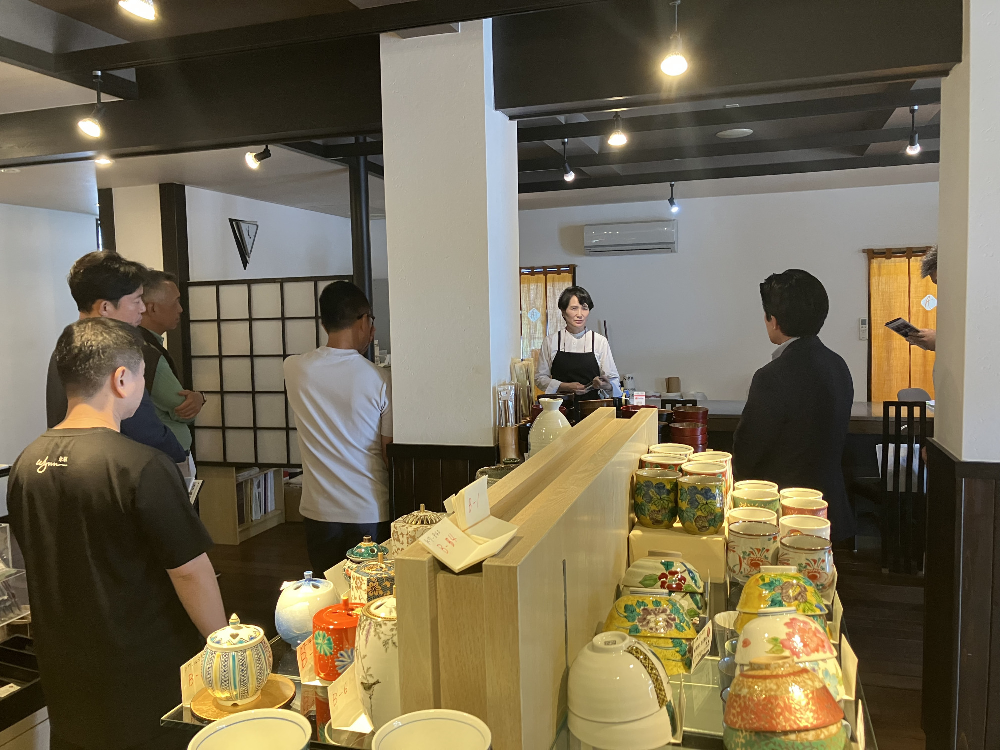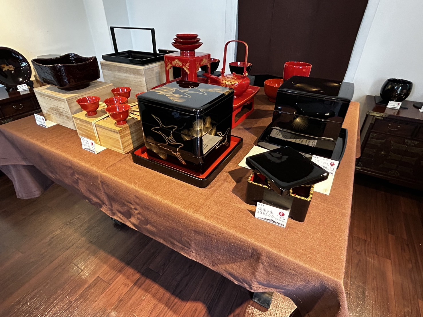 高澤ろうそく店から商店街を歩いて、漆陶舗あらきに向かいます。こちらも老舗の店舗が地震で壊れたことで場所を少し変えて営業しています。あらきさんでは輪島塗だけでなく、九谷焼や山中塗など石川県の伝統工芸品がたくさん並んでいます。奥の蔵を改装した場所には落ち着いて集中できる体験スペースが設けられ、輪島塗の沈金体験では、自分で考えた絵柄を好みの箸や銘ー皿などの商品に絵付し、世界に1つだけのオリジナル作品を作ることができます。