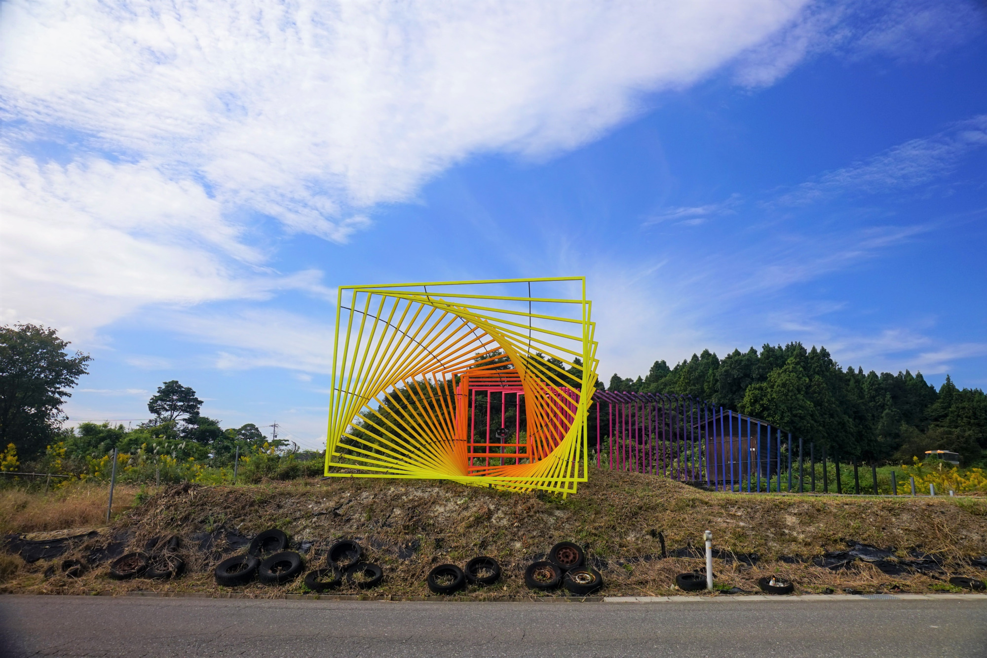 蛸島駅は、国鉄能登線の終着駅として開業したが、能登線の廃線に伴い廃駅となった。作家は、「 旧鉄道の終着点を地域の再生と未来を望むような場所に」という思いで作品を構想。線路跡に置かれたカラフルなフレームは駅に向かって渦を巻くように広がり、あたかも地域の過去・現在・未来を旅するかのように、劇的な視界の変化を楽しめる。