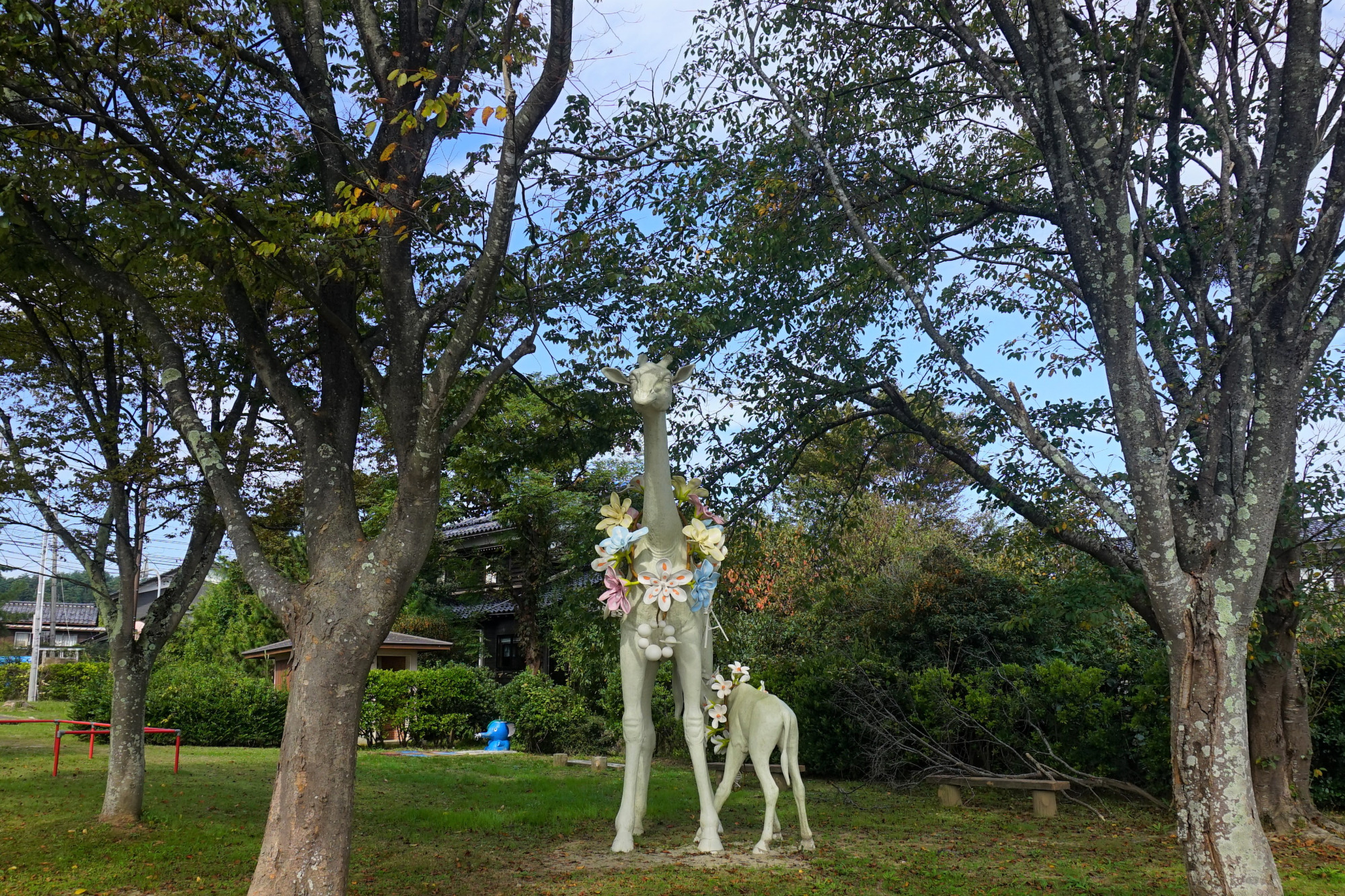 作家は、珠洲の海岸にたくさん辿り着く漂着物と、インドの動物園で起きたキリンの交換プログラムの出来事とを重ねた。故郷や地域性が乏しくなってきている現代への問いかけとして、「迷子のキリン」の親子を制作。母親は海を見つめ、赤ん坊はお乳を吸うのに忙しくしている。彼らに帰る家はあるのだろうか?もしあるとすれば、それはどこなのだろうか?