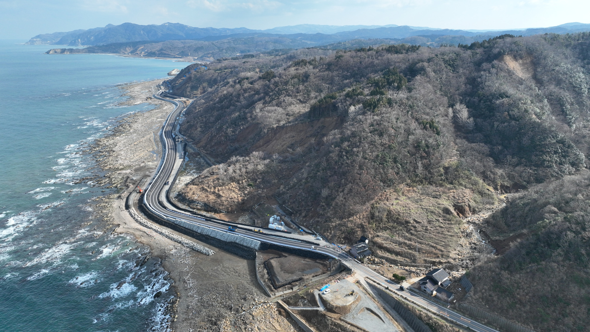 この写真は山の土がくずれて通れなくなった道のかわりに、もともと海の中だったところに道を作ったものだよ。いつか正式な道ができたら通れなくなってしまうかもしれない、今しか見られないばしょだ。