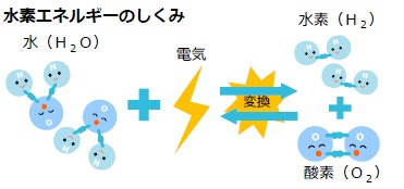 水に電気を流すと水素と酸素に分かれる。これを反対にすると、水素と酸素をくっつけると、水と電気が作れるんだ。このしくみを1つの箱に入れて電気を作るのが燃料電池だよ。