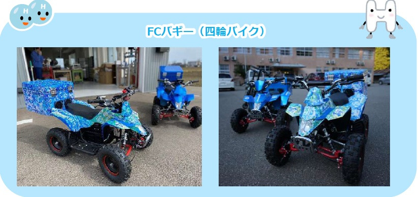 バギー:後ろの箱に水素のキャニスターが入っている。ガソリンなしで動く車だよ。