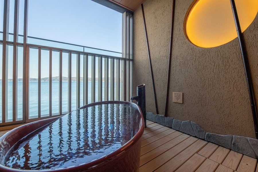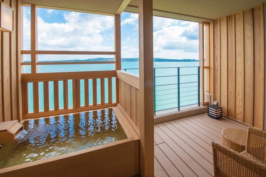 七尾湾に面したオーシャンビューの客室は天然温泉露天風呂付き。
