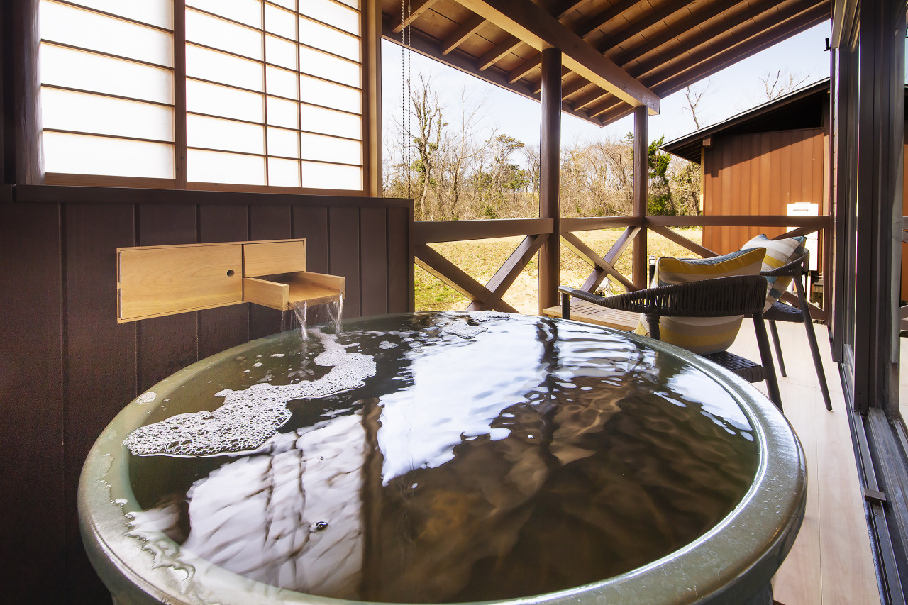 洗練されながらも、どこか落ち着く和モダンの空間。爽やかな海風を浴びながら、“美人の湯”に身を委ねてみてはいかがですか。離れの露天風呂は大浴場と同じ自家源泉100%の天然温泉。しかも“源泉かけ流し”です。誰にも邪魔されないプライベート空間で、あたかも温泉を独り占めしたかのように好きな時に好きなだけ、何度でも美人の湯に浸れる至福の時間を心ゆくまでご堪能ください。