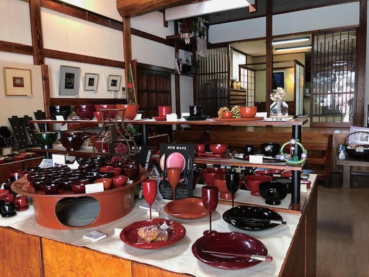 工房ではミシュランガイド掲載の有名店の業務用漆器の受注生産が主流の塗師屋。本店内は漆塗の太い梁が見える吹抜けの木造三階建で、1階は日常に気楽に使える器、2階・3階はギャラリー。(工房見学可能)