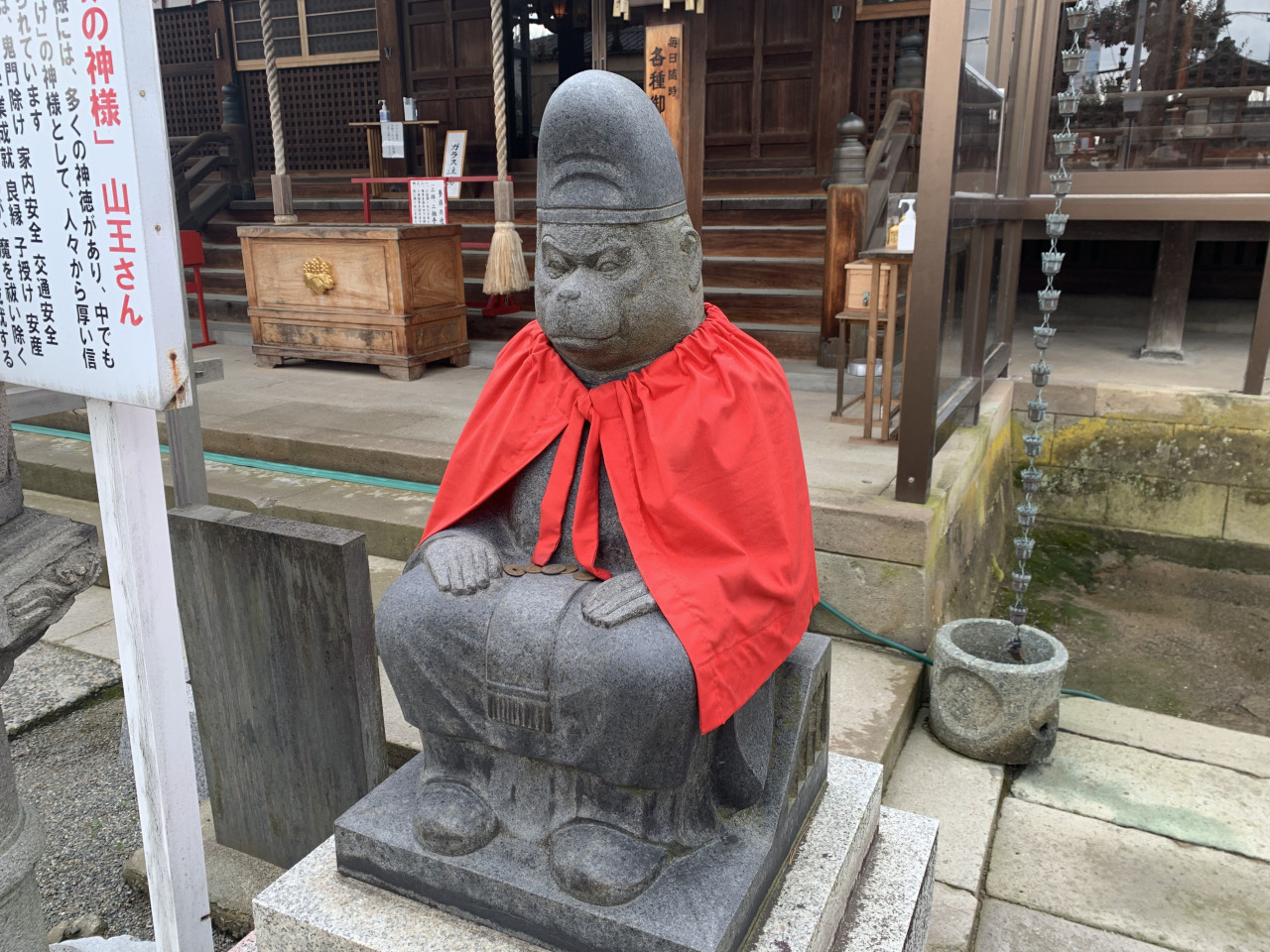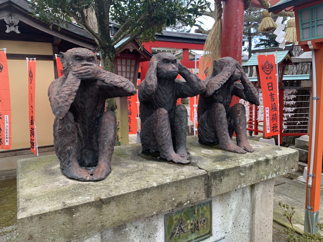 町の中心にある、破風付の朱色の鳥居が印象的な山王宮・本折日吉神社は、昔から「山王さん」「日吉さん」と呼ばれ親しまれています。全国に約二千ある日吉神社・日枝神社・山王神社の総本宮である滋賀県大津市の日吉大社は、猿を神の使いとして崇拝することで知られ、平安京の鬼門に位置することから、鬼門除け・災難除けの社として崇敬されるようになりました。