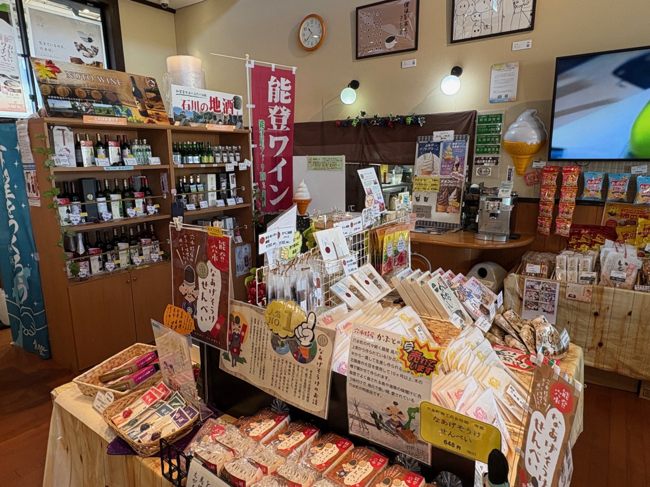 地元穴水町の特産「牡蠣」・「能登ワイン」をはじめ、能登の塩・干物などの奥能登の海産物や地酒・お土産を販売しております。