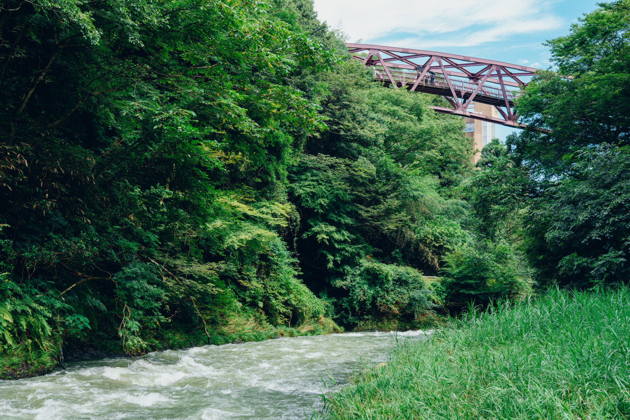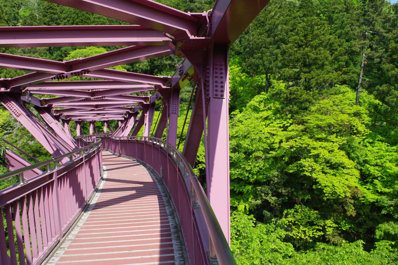 他に類のない形状と美しい紅紫色のモダンさ、橋上から眺める鶴仙渓は絶景です。