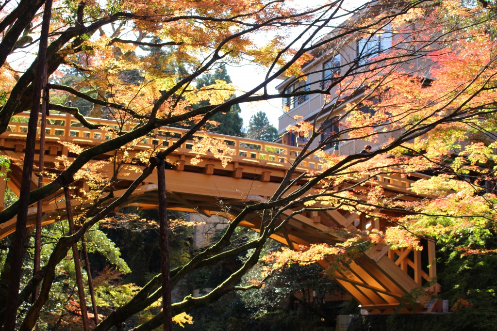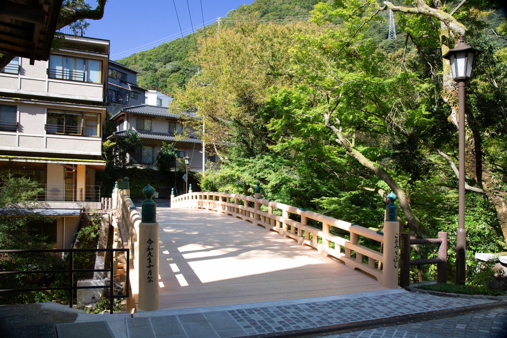 鶴仙渓に架かる総ヒノキ造りの風雅な橋です。四季を彩るその風情に、日本の情緒が感じられます。山中温泉を代表する名勝で、橋から眺める鶴仙渓は絶景です。