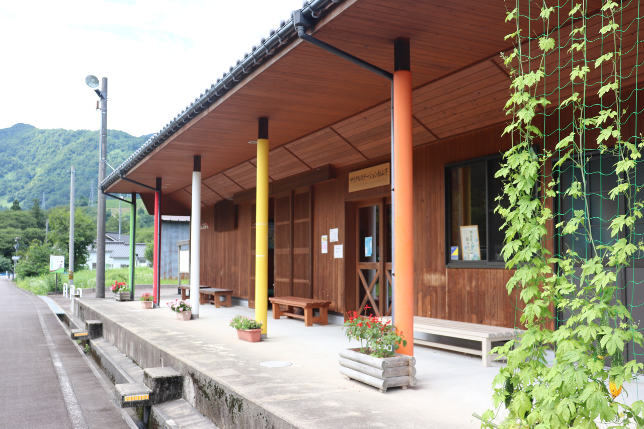 かつての北陸鉄道金名線の終点「白山下駅」があったところ。金名線は1987年に廃止されて、線路跡がサイクリングロード「手取キャニオンロード」になりました。白山下駅跡の周辺は「白山下サイクリングパーク」として整備され、新たに駅舎風の建物が建てられて、サイクルステーションとして利用されています。トイレも完備しており、サイクリング中の休憩にも便利です。