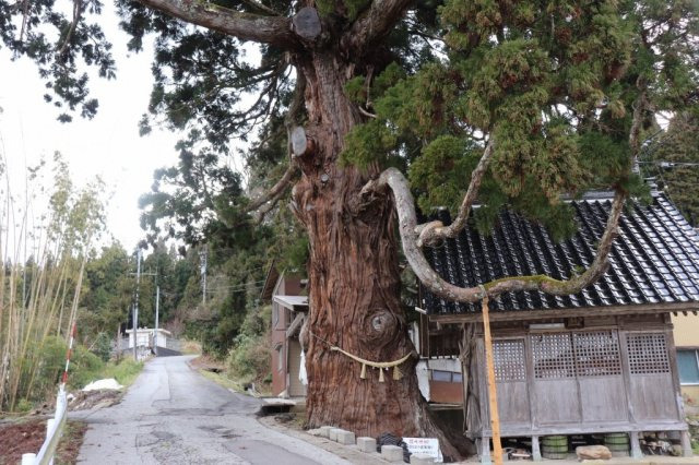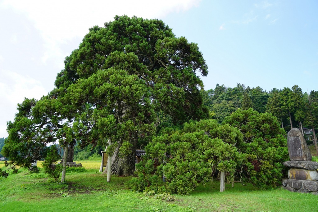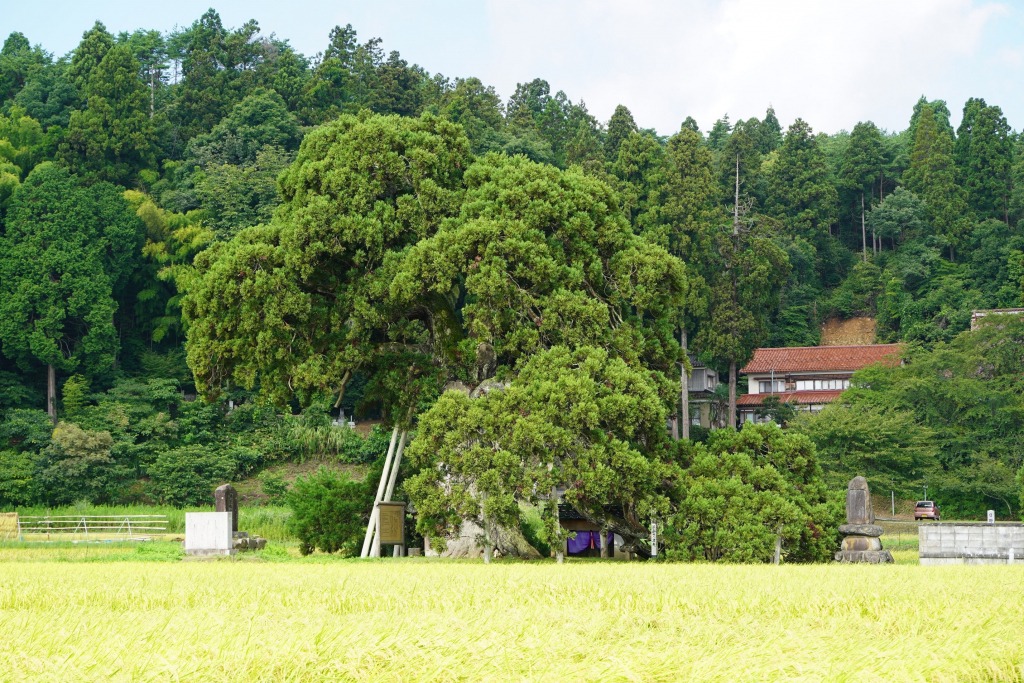 八百比丘尼(はっぴゃくびくに)が昼食時に杉箸を逆さに挿し、そこから枝葉が出たとの逸話も伝わっています。高さが約12メートル、広がりが30メートルにも及ぶこの杉は、能登の一本杉ともいわれ、その迫力は圧巻です。