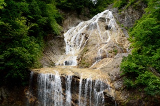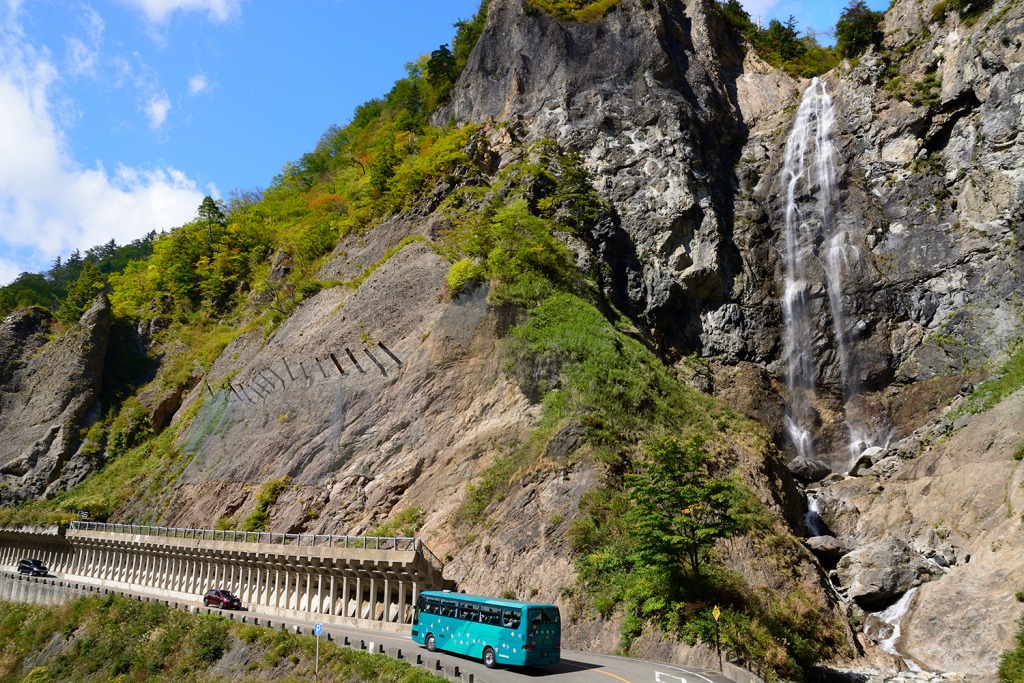 白山白川郷ホワイトロードの中ほどにある大滝で、沿道随一の名所。落差が86mもあり、時には水しぶきが道路をおおうこともあります。駐車場のすぐ近くに滝つぼがあり、水が断崖を流れ落ち、むき出しの岩に衝突するダイナミックな眺めに思わず歓声を上げる見物客も。