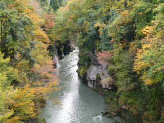 手取川の流れがつくりあげた美しい峡谷。釜清水町の「黄門橋」から河原山町「対山橋」までの約8kmにわたって高さ20~30mの絶壁が続いています。