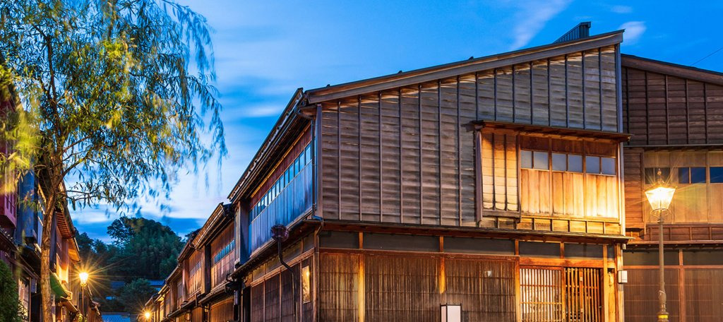 金沢を代表する観光地の一つ「ひがし茶屋街」。美しい出格子と石畳が続く古い街並みは国の重要伝統的建造物群保存地区に選定されています。