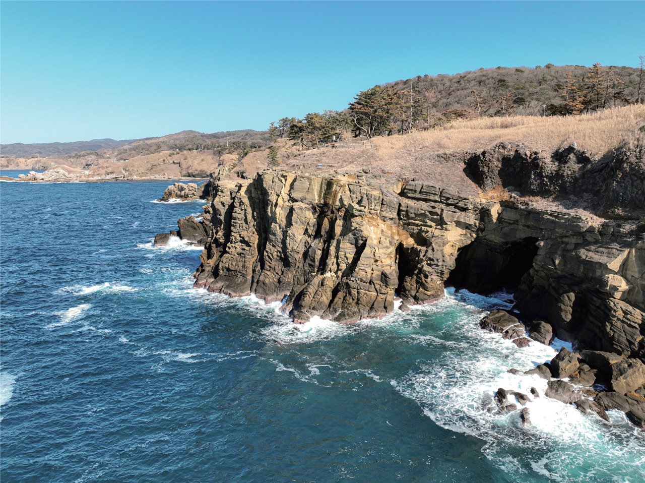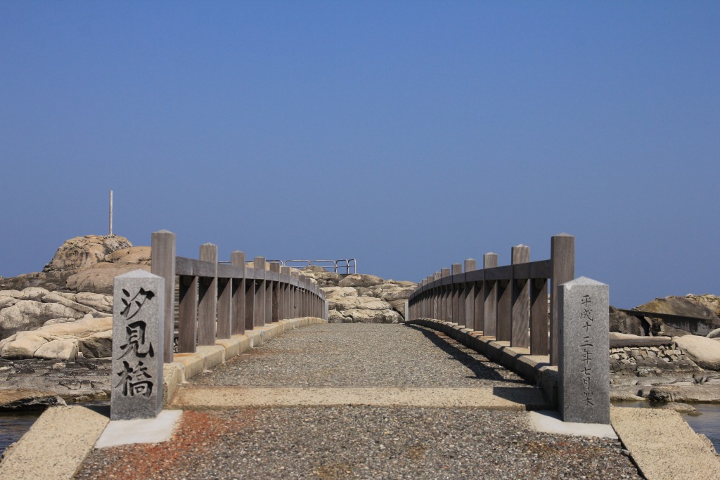 東西400メートル、南北150メートルにわたる海蝕作用でできた白っぽい岩礁が広がる、海岸沿いを1周するコースは磯遊びや釣りに最適です。