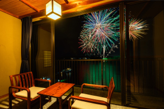 片山津温泉の中心部にある「湯の元公園」から「浮御堂」に出て眺める花火は絶景で、また、反対側の湖畔から温泉の夜景と合わせて眺めるもよし、旅館のお風呂に浸かりながらゆったり眺めるのもよし、と、いろんなバリエーションで間近に花火の大迫力が楽しめます。