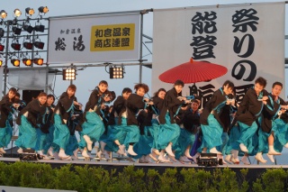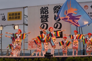 鳴子を手に自由奔放・華麗で優美な踊りが和倉温泉街で繰り広げられます。"能登は一つ「風土(つち)の唄で踊れよさこいただ狂え」"をテーマに毎年スケールアップしてゆくと同時に、踊り子の振り付けもサンバ調、ロック調、古典の踊りなど、静と動が見事にミックスされた勇壮且つ華麗・艶やかで見応え充分です。