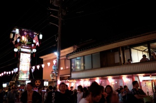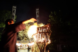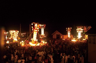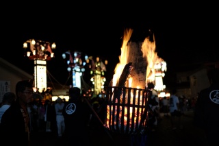 御祓いのあと、くじで決まった1番の町から神輿を先導して大地主神社へ。境内に勢ぞろいした11基の奉燈には笛、鉦、太鼓の囃子衆が乗り込み、50人余りの若衆が担ぎ出します。赤ーと燃え上がるかがり火の周囲を競い合うように奉燈が疾駆。時には息をぐっと止めて見入るほどに凄まじい勢いで乱舞します。