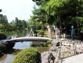 金沢城は1583年前田利家が金沢城主となり本格的な近世城郭へと姿を整えていきました。本丸が1631年の大火で焼失後、二の丸に御殿が造られ、加賀百万石の藩庁として藩政の中心となりました。重要文化財の石川門、三十間長屋、鶴丸倉庫を特別公開する日は、ガイドを堪能しませんか。また、金沢城は「石垣の博物館」と呼ばれています。兼六園は、日本三名園の一つに数えられ、特別名勝に指定されています。「宏大・幽邃、人力・蒼古、水泉・眺望」の六つの素晴らしい景色が兼ね備わっているとの意味から名づけられています。