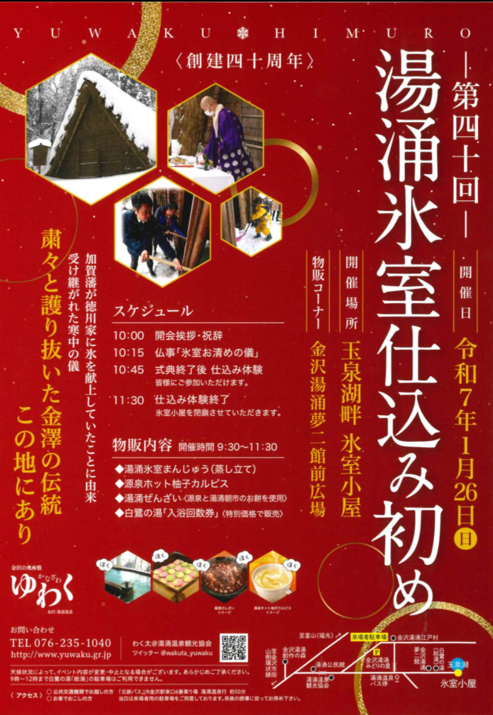 雪詰めのほか、氷室酒仕込み、和太鼓演奏、氷室まんじゅう・温泉玉子販売などが行われます。
