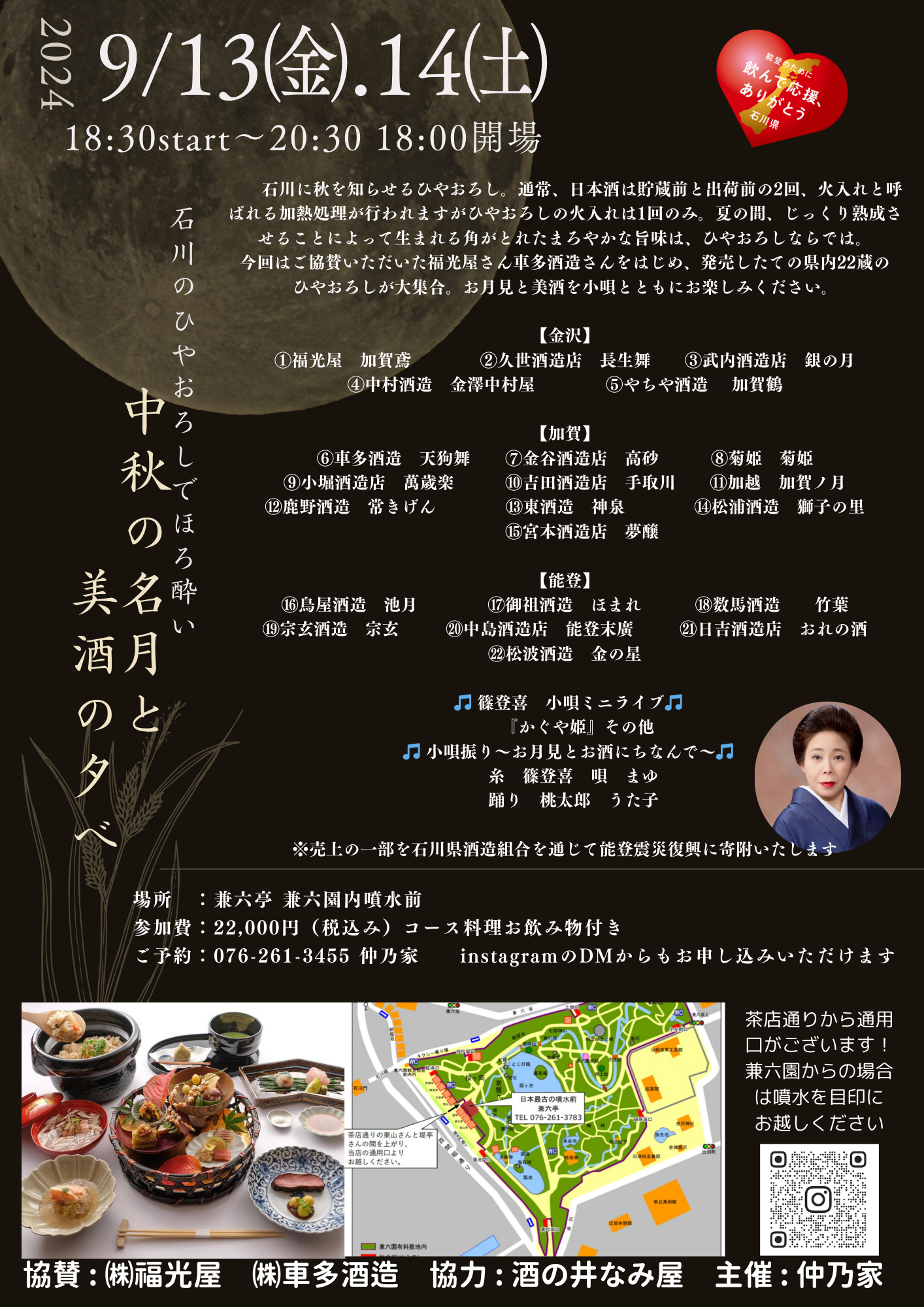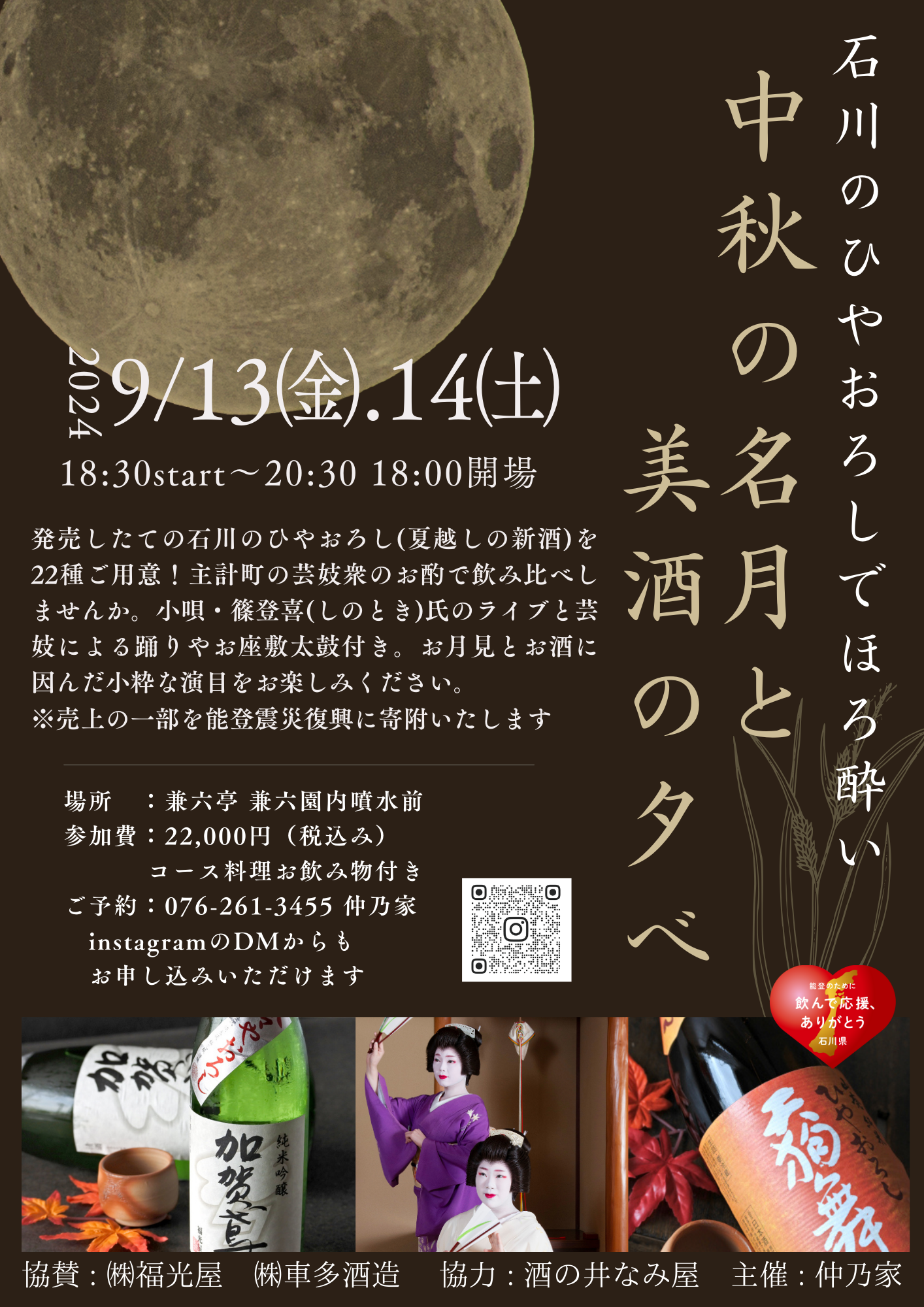 石川に秋を知らせるひやおろしをお月見しながら芸妓のお酌で楽しみませんか。ひやおろしとは通常は出荷まで二度火入れする新酒を一度だけ火入れし、夏の間じっくりと熟成したまろやかなお酒です。今回は、能登から金沢、加賀まで22種類の発売したてのひやおろしをご用意。お月見やお酒にちなんだ小唄・篠流家元の篠登喜氏のミニライブや主計町芸妓の踊りや太鼓の披露もございます。ひやおろしの飲み比べや芸妓のおもてなしで初秋の夜をお楽しみください。