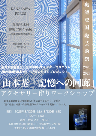 能登半島地震で倒壊した、山本基さんによる奥能登国際芸術祭パーマネント作品「記憶への回廊」。作者自ら採取した作品の重要な構成要素である塩の結晶を用いて、アクセサリー作りを体験。作品との直接的なつながりは勿論、お手元に携えることで、さまざまな記憶が未来に向かって小さな輝きを放つ存在になりますように。3月15日から4月13日まで開催開催されています「奥能登珠洲復興応援企画展〜奥能登国際芸術祭〜」の期間内のスポットイベントの一環「記憶のかけら」プロジェクト。ワークショップ日時以外の期間中も、被災した「奥能登曼荼羅」の一部の展示や被害状況、いま見に行ける常設作品などの紹介や関連物販なども行われております。