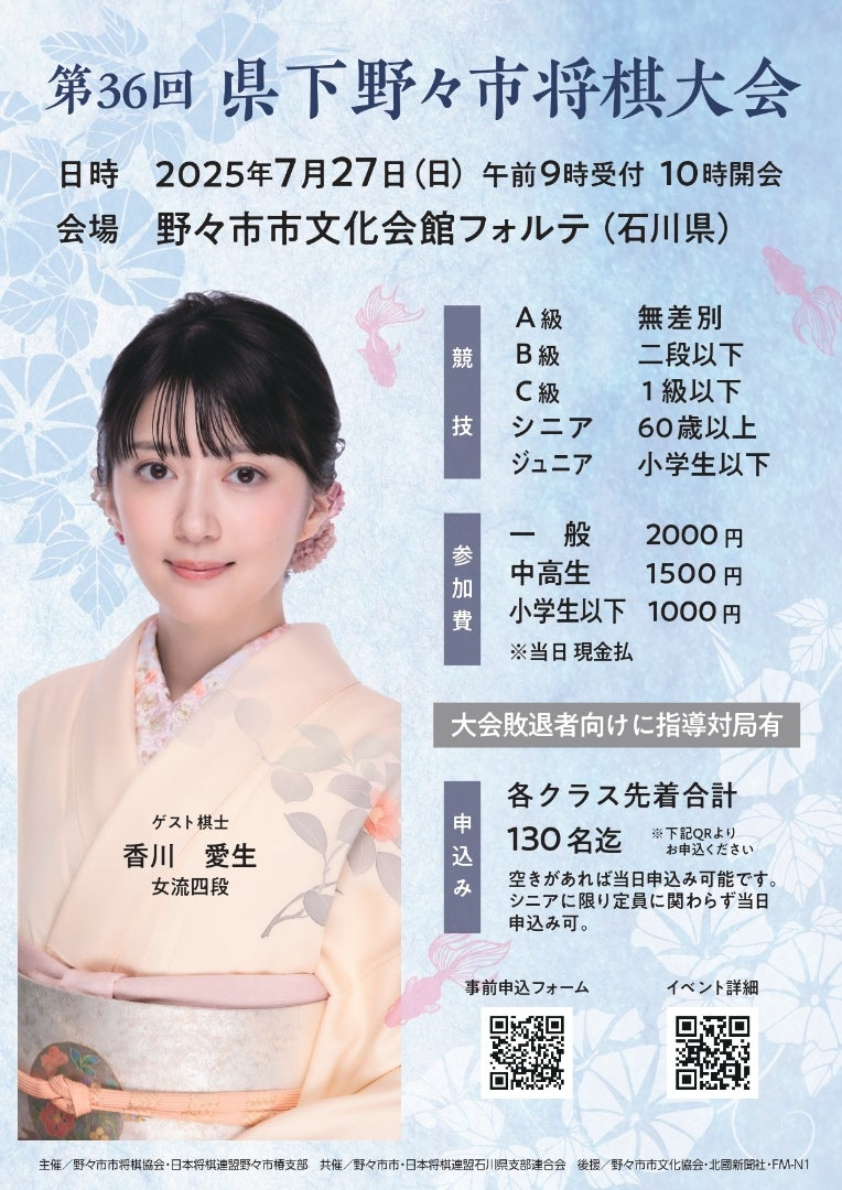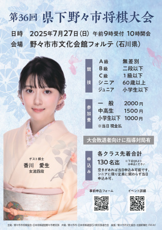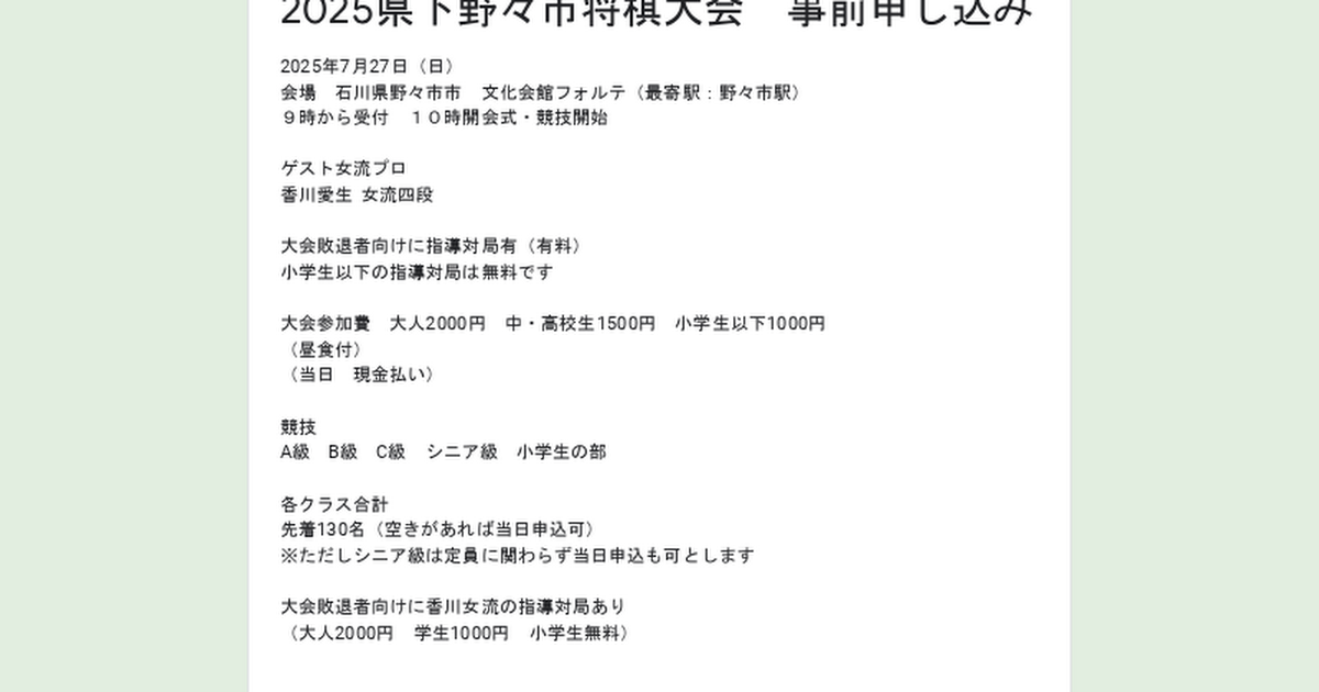 2025県下野々市将棋大会 事前申し込み2025年7月27日(日)会場 石川県野々市市 文化会館フォルテ(最寄駅:野々市駅)9時から受付 10時開会式・競技開始ゲスト女流プロ香川愛生 女流四段大会敗退者向けに指導対局有(有料)小学生以下の指導対局は無料です大会参加費 大人2000円 中・高校生1500円 小学生以下1000円(昼食付)(当日 現金払い)競技 A級 …