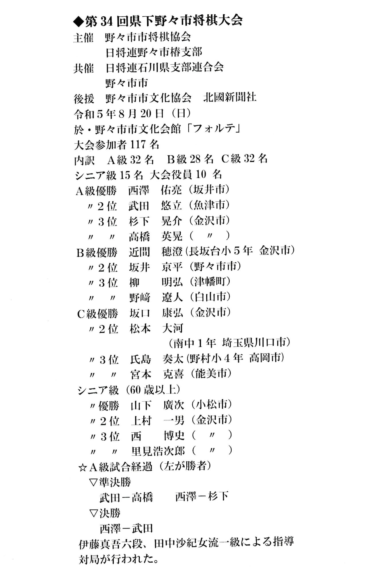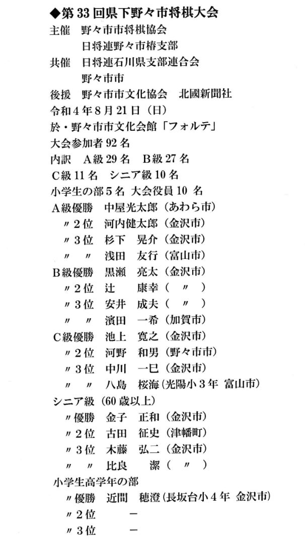 『【大会結果】第33回県下野々市将棋大会』■石川県の将棋大会情報 (石川県支部連合会)■石川県将棋大会結果 New!!夏休み野々市こども将棋大会(大会結果) 『【大会結果】野々市こども将棋大会』■石川…