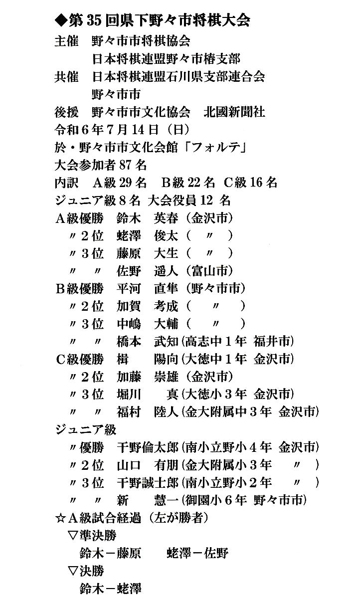 『【大会結果】県下野々市将棋大会』■石川県支部連合会 Newホームページが新しくなりました ■石川県将棋大会結果 ■野々市将棋協会(順位戦) ■富山将棋情報 ■富山県支部連合会 ■20…