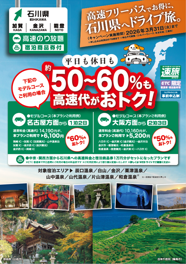 「高速道路周遊パス」と石川県内の対象宿泊施設で使える「宿泊商品券1万円分」がセットでおトク!