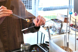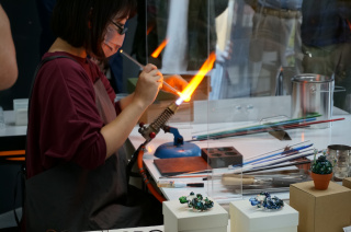 北陸在住のガラス作家によるランプワークの制作実演。バーナーの炎でガラスを溶かし、華麗な技を披露します。