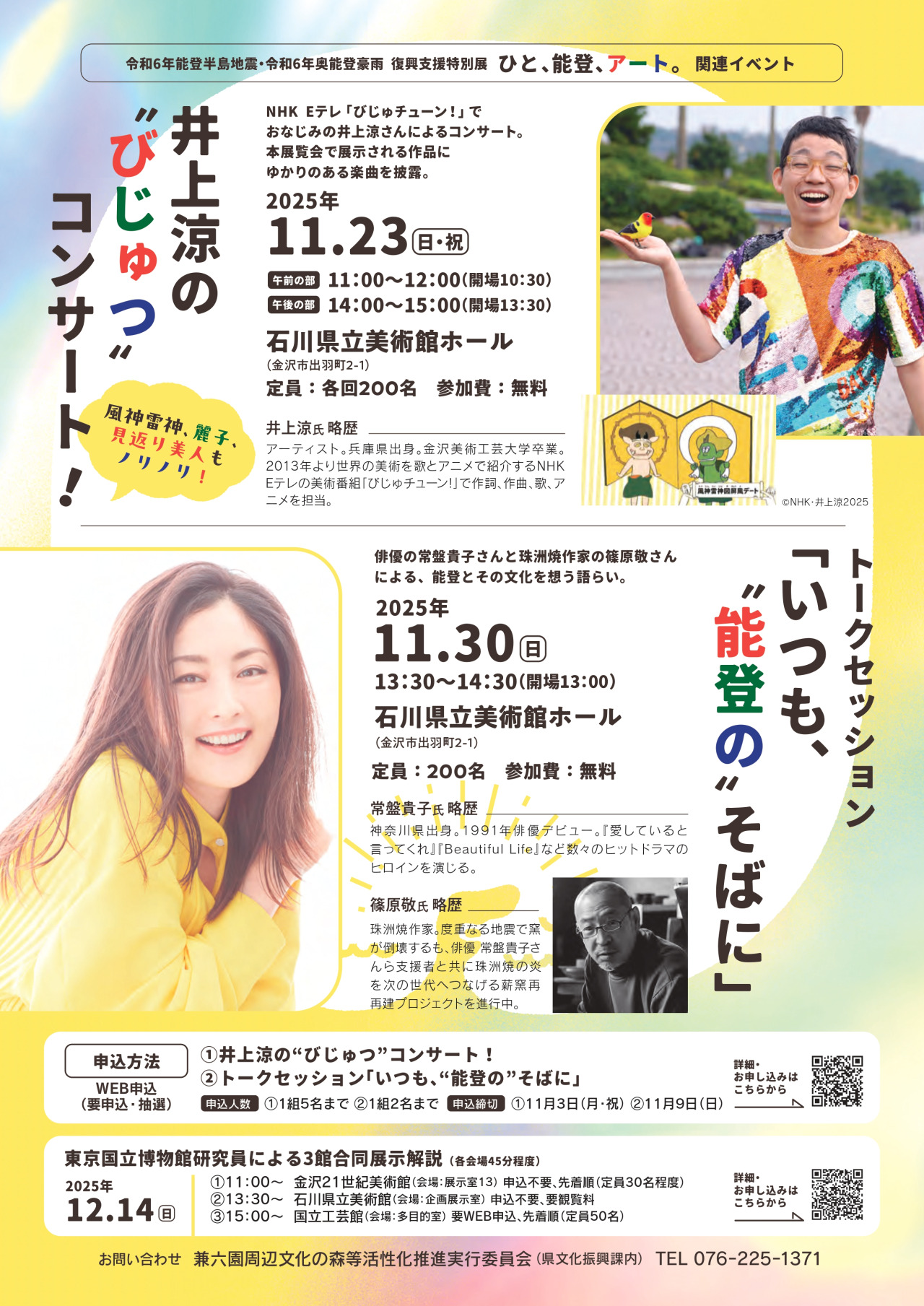 展覧会名称 | 令和6年能登半島地震・令和6年奥能登豪雨復興支援特別展 「ひと、能登、アート。 文化財がつなぐ。Art for the Noto Peninsula」 | ||
