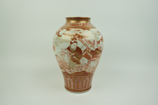 九谷焼の草創期「古九谷」の時代から使われている「九谷五彩」。この伝統色ともいうべき5色の内、赤だけが他の4色とは違う性質を持ちます。他の4色(黄、緑、紫、紺青)が厚く盛り上げて塗ることで強い色を発色させるのに対し、赤は他の色とは原料の組成が異なるため、盛り上げる必要がないので、運筆の勢いを生かしたり、比較的細かい描写に向いていることは、先人たちも早くから気づいていました。しかし、その特性が最大限に引き出され、九谷焼の伝統様式の一つ「赤絵細描」として高められるには、「古九谷」廃絶から更に百数十年後、「再興九谷・吉田屋窯」の窯元を受け継いだ「宮本屋窯」の陶画工、「飯田屋八郎右衛門」の登場を待たなければなりませんでした。