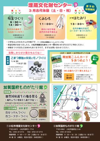 勾玉づくりやくみひもづくりなどの古代ものづくり体験、出土品整理体験、弓矢体験ほか、親子で楽しめるメニューがあります。