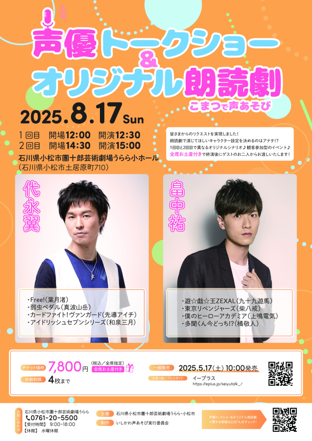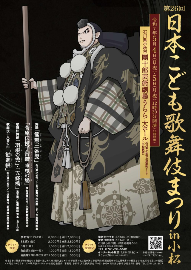 - 【出演団体】・石川県小松市/こまつ歌舞伎未来塾 こまつ邦楽舞踊教室・愛知県豊田市/小原歌舞伎保存会・東京都/歌舞劇団 飛鳥しぶさわ座・石川県小松市/子供歌舞伎「勧進帳」実行委員会【チケット取扱】《電話先行予約開始》2025年3月13日(木)10時~ 0761-20-5501…