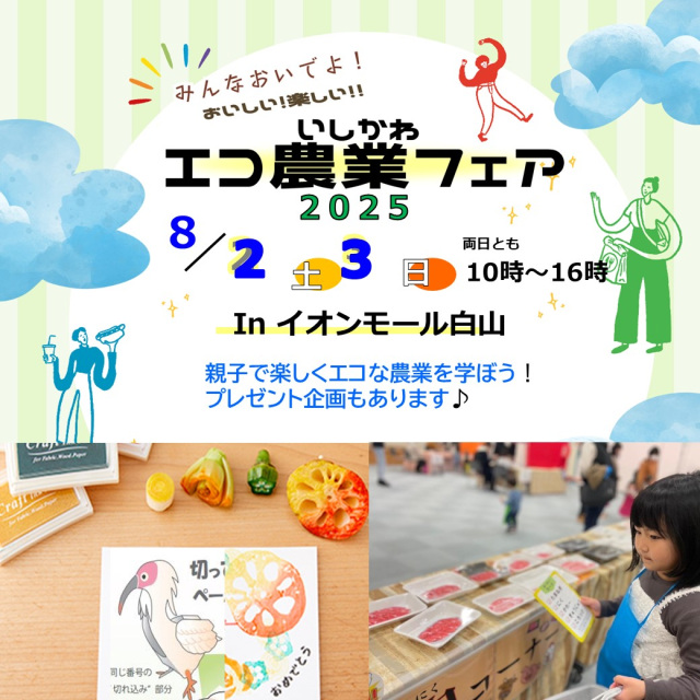 - 環境保全型農業を楽しく学べる場として、イオンモール白山において「味わう・触れる・まなぶ」をテーマとして体験型イベントを開催します!親子で楽しんでいただける内容となっておりますので、ぜひ、ご家族揃ってご参加下さい!※先着200名様に「特別栽培米のパックご…