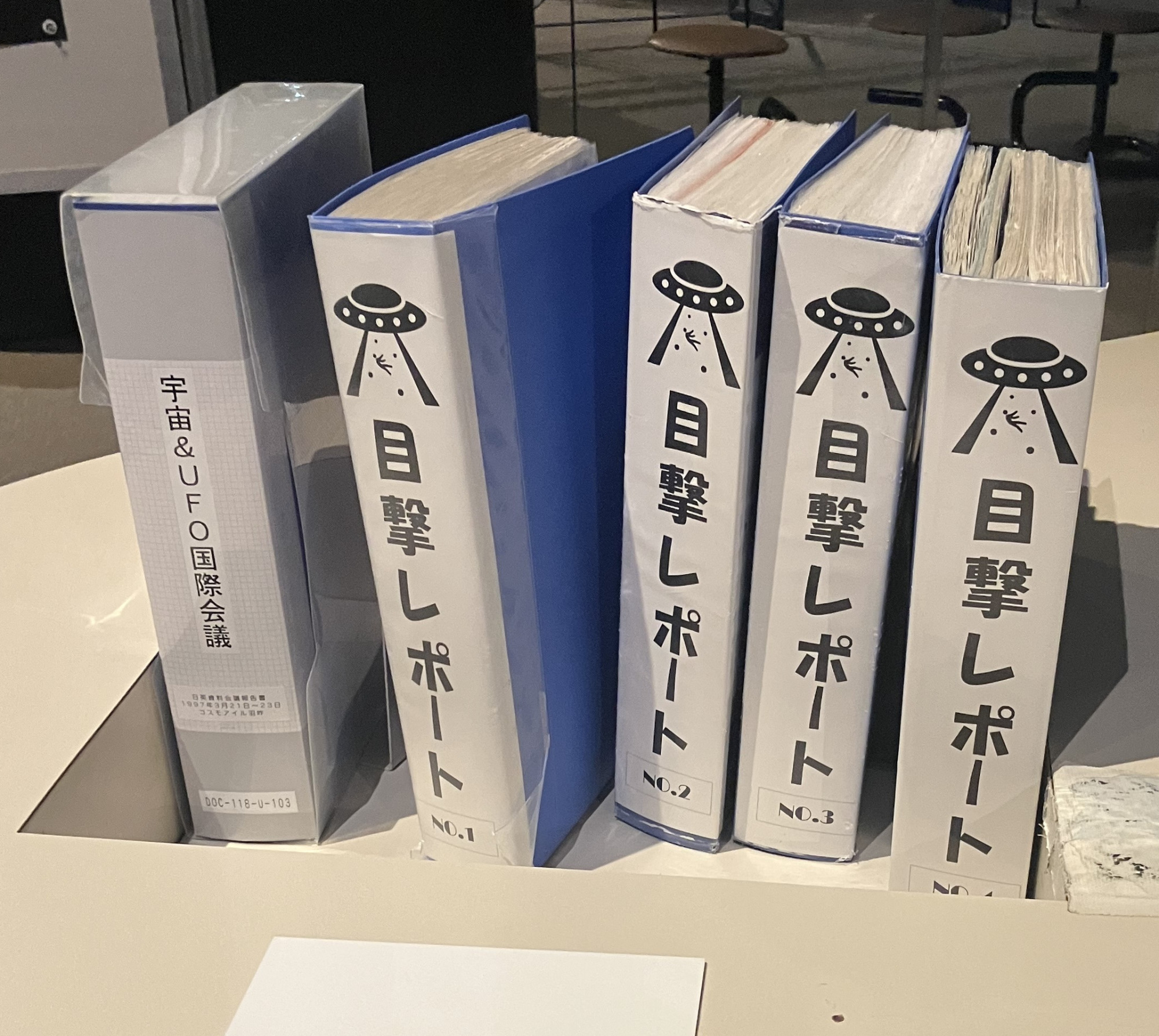 宇宙科学展示室の一角には、来館者によるUFO目撃レポートをまとめたファイルが!