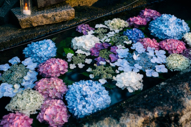 津幡町にある倶利迦羅不動寺の鳳凰殿には、様々な種類のあじさいが咲いています。また、季節の花が浮かぶ花手水は写真映えし、大人気です。涼し気な色合いのあじさいが浮かんだ花手水は、梅雨の蒸し暑い時期に涼をもたらしてくれますよ。