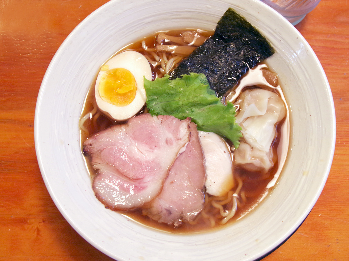 創業からのベーシックな醤油スープに、炭火焼・低温調理の2種のチャーシュー、特製ワンタン2つと味玉がトッピングされた、王道の味です。