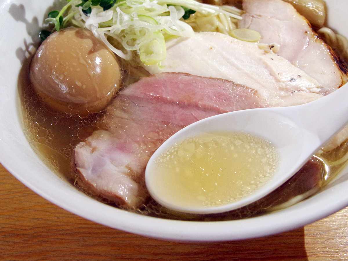 澄んだスープは、口に含んだ瞬間、かつお、昆布、煮干しの豊かな香りに、鶏や野菜の旨みが後から追いかけてきます。