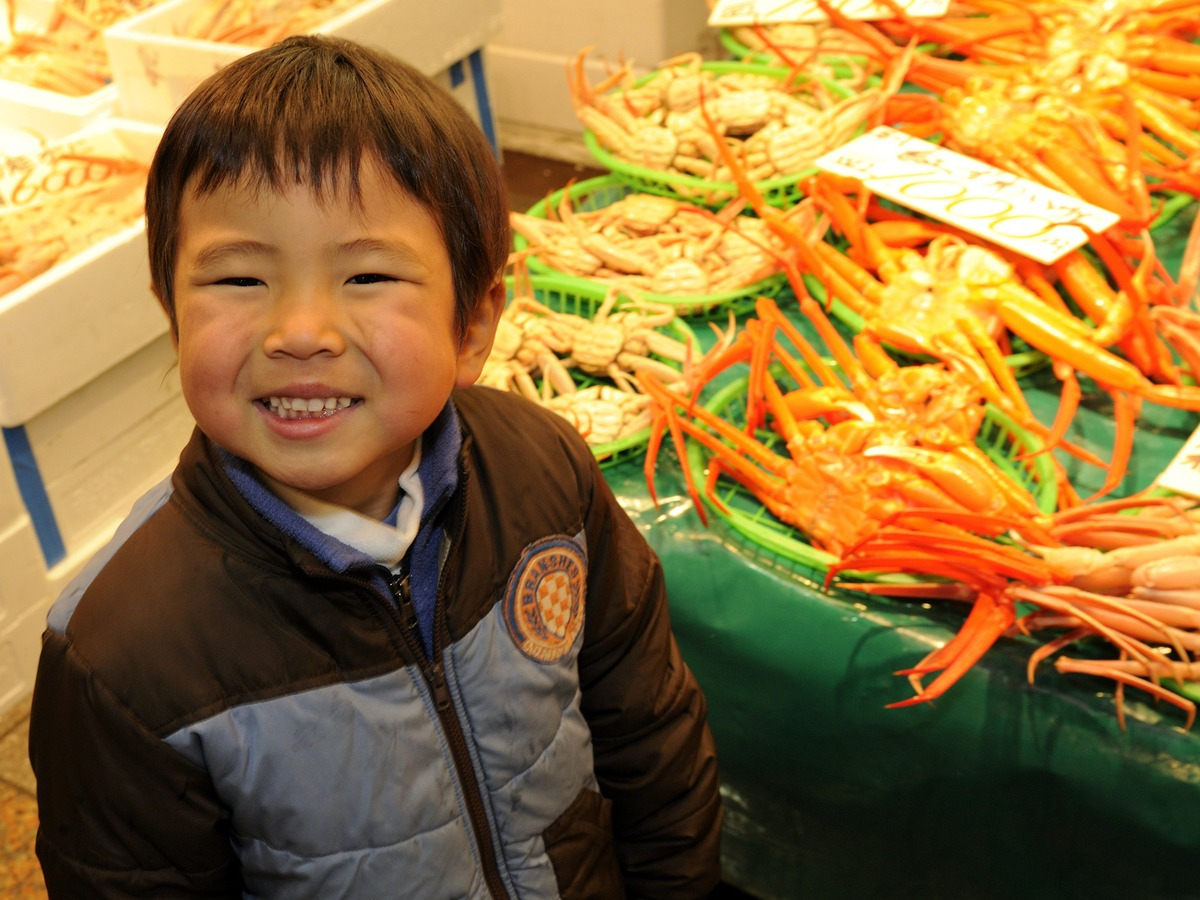 狭い小路を挟んで並ぶ約170店の店先で、日本海の新鮮な魚介や地元産の野菜、果物を中心に、漬け物、菓子類、生花、衣類など、さまざまな商品が威勢の良いやりとりの中で売り買いされ、市場はいつも活気に満ち溢れています。