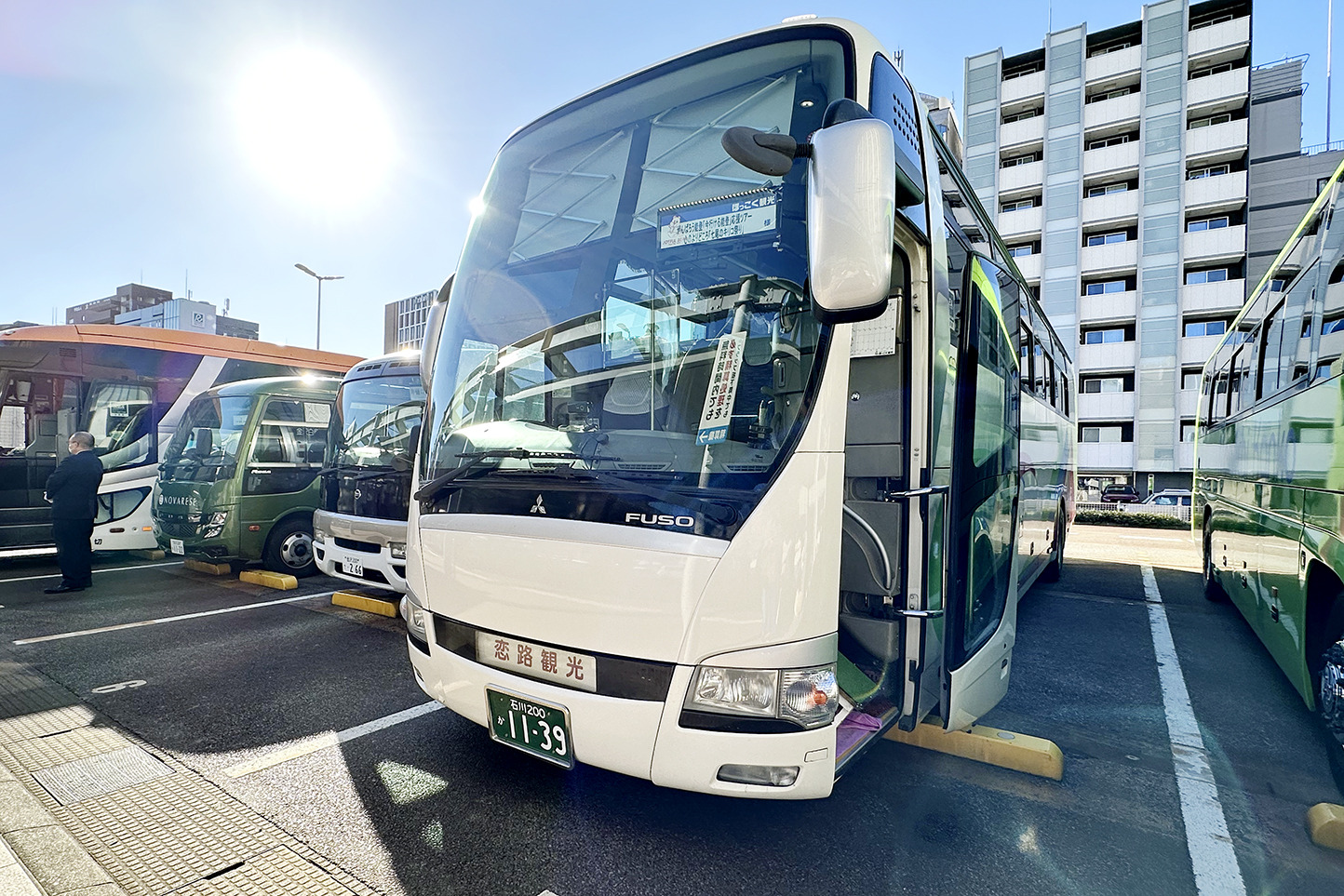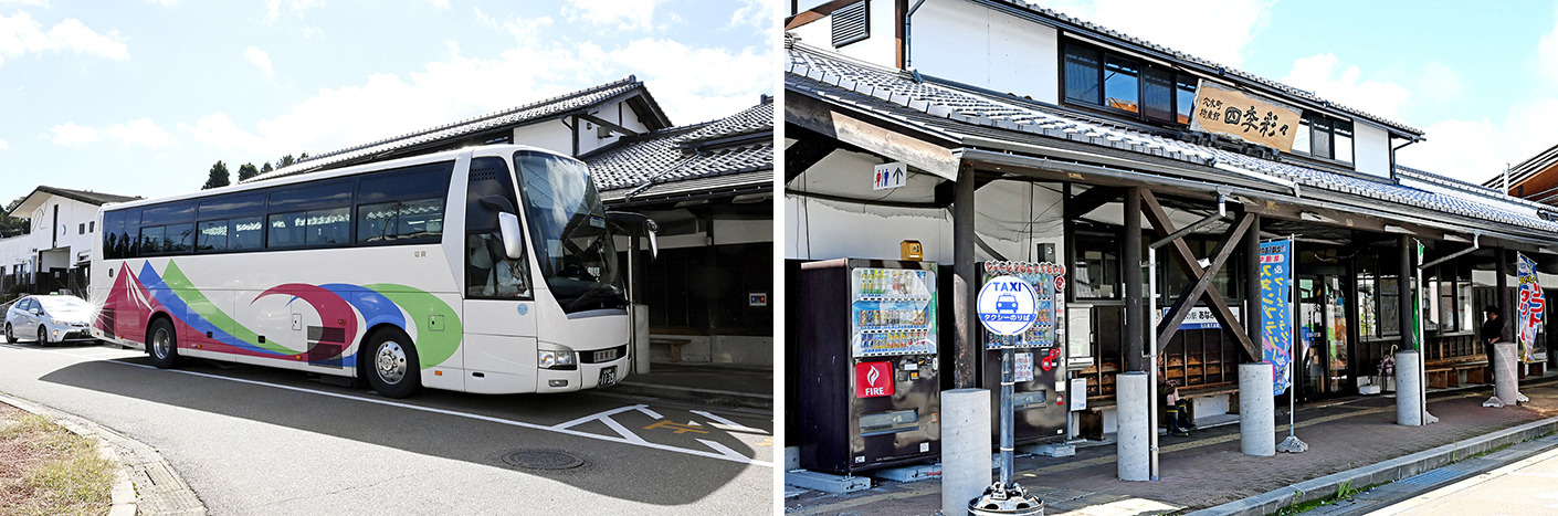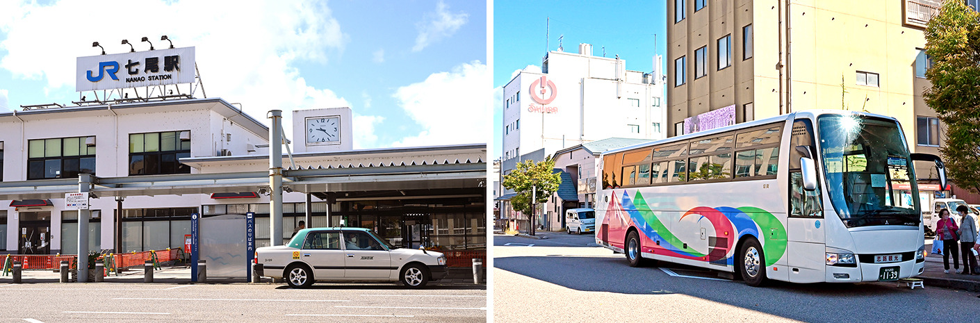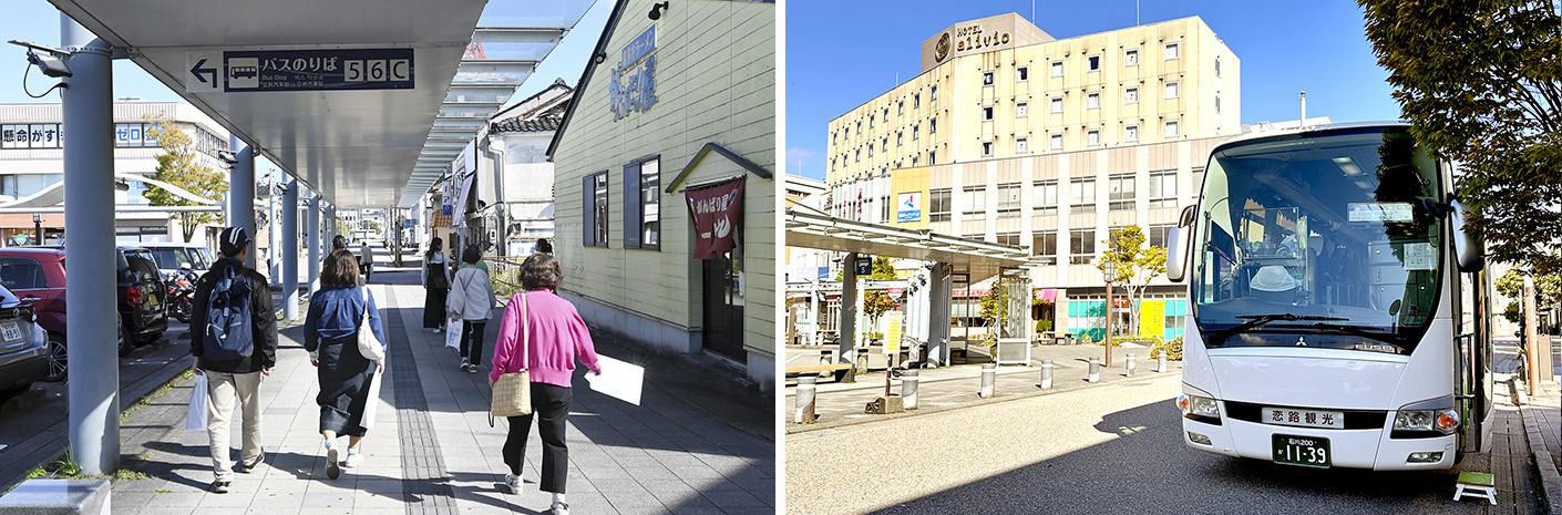 「七尾駅」を出ると、駅前のロータリー右手に「恋路観光」の貸切バスが待っていました。ここからはバスで次の目的地「のと里山里海ミュージアム」へ向かいました。