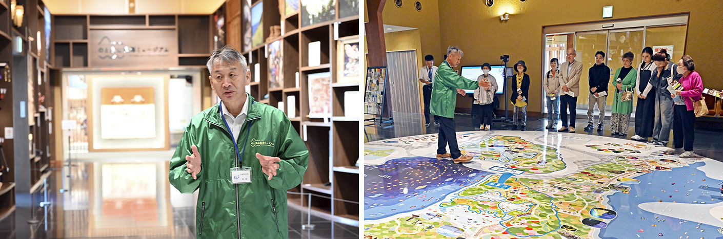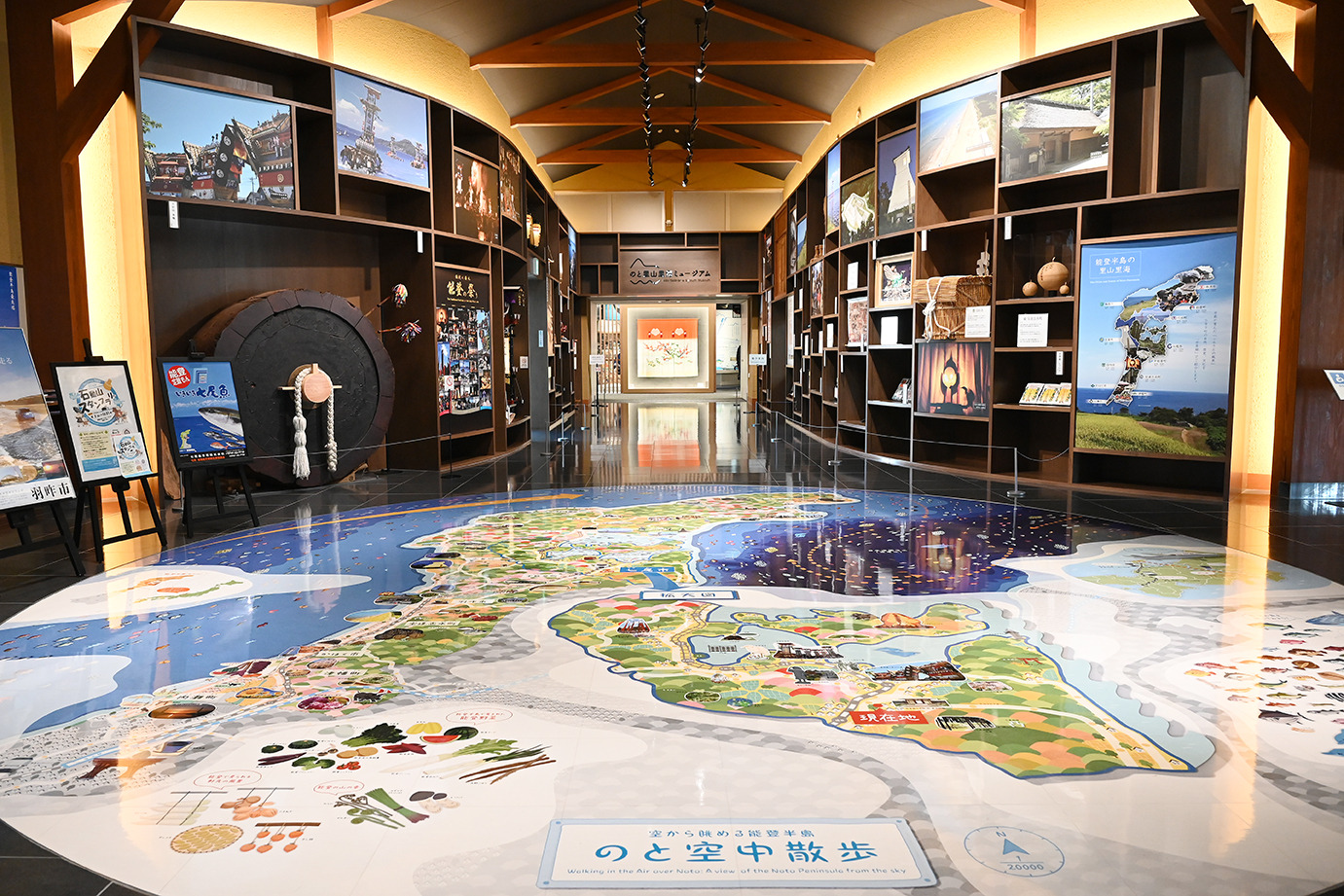 ミュージアムのエントランスホールの床には、能登全域の見どころが一目でわかる絵地図「のと空中散歩」が描かれていました。出迎えてくれた副館長の和田学さんが絵地図を見ながら、能登と加賀の地理的な境界、「能登国」立国の歴史などを解説してくれました。