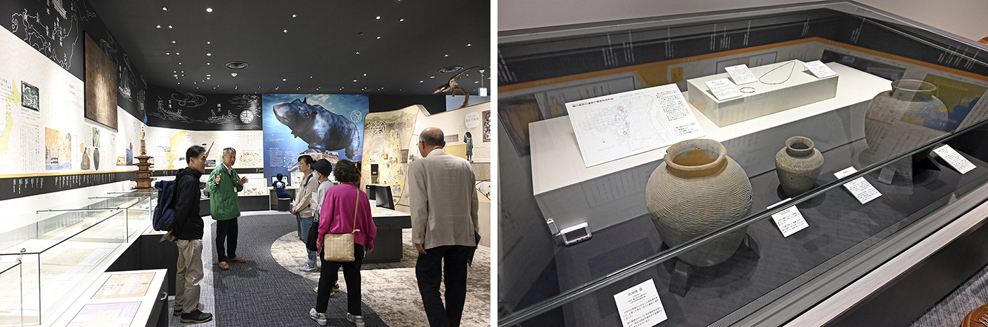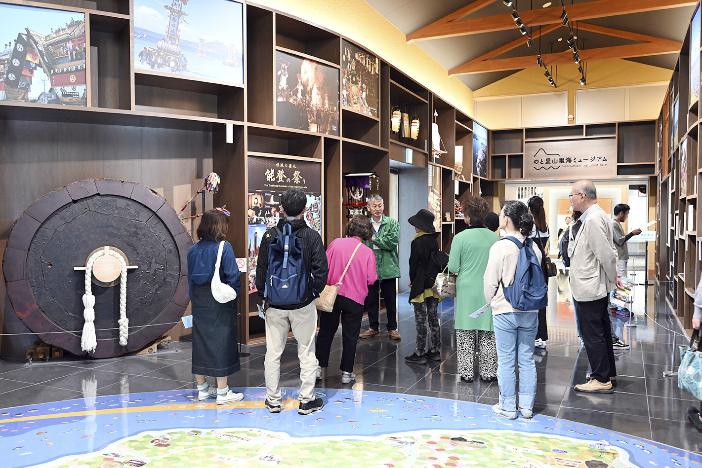 - このミュージアムでは、能登半島と能登国の歴史・文化・自然などを、わかりやすく展示・紹介しています。エントランスに展示している「青柏祭」の「でか山」の木製車輪はケヤキの大木から約100年前に作られ、30年ほど前まで実際に使われていたものです。「でか山」が巡行する一本杉通りは七尾でも被害が大きかった地域です。そうした地を訪れて今起きていることを知ることは歴史の学びとなり、時代の証人として次代へ伝えていくことも大切なことです。
