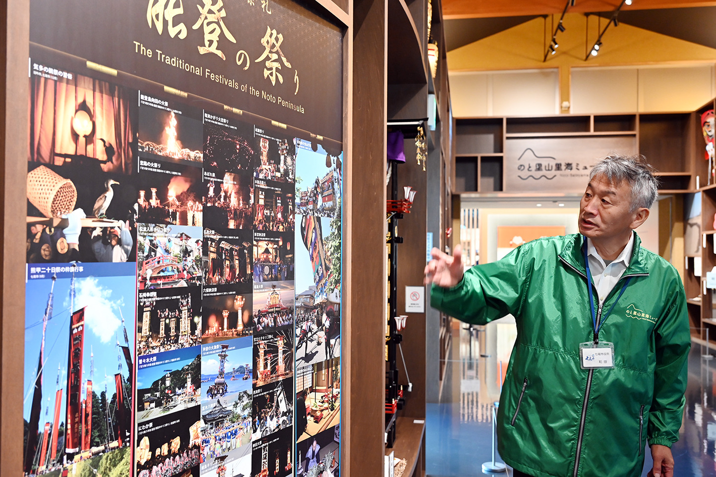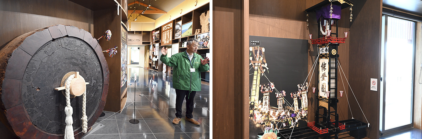 七尾市の「青柏祭(せいはくさい)」の「でか山(曳山)」で実際に使われていた直径2メートルもある木の車輪や、「石崎奉燈祭」の「奉燈(キリコ)」の模型も展示されていました。「能登には数え切れないほど多くの祭りが地域ごとにありますが、今年は元日に発生した能登半島地震の影響で、伝統の祭りを中止したり、規模を縮小した地域がほとんどでした」と和田さん。