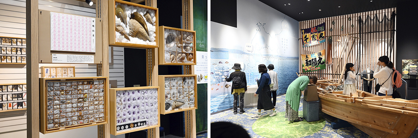 館内には七尾の祭りコーナー、歴史コーナー、里山コーナーなどがあり、見て、ふれて、楽しみながら学べる体験型の展示になっています。里海コーナーでは伝統的な伝馬船と漁具の実物が展示されていて、舟に乗ったり、本物と同じ重量の鰤の模型を持ち上げてみたりして、今度は子どもや孫と訪れたいという声も聞かれました。