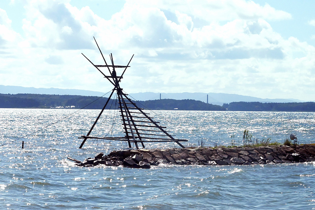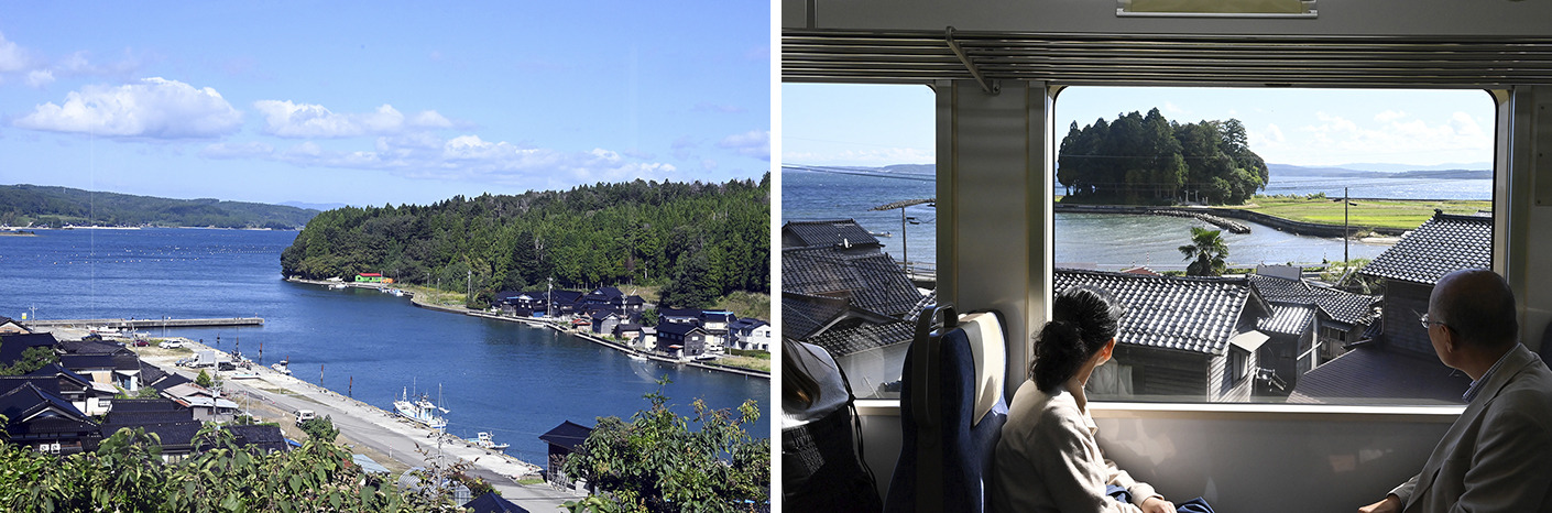 穴水町の沿岸に点在している「ボラ待ちやぐら」も車窓から眺めることができました。江戸時代から伝わる日本最古の漁法を観光用に復元した「ボラ待ちやぐら」は、地震の揺れに耐えて崩落を免れたことから地元では「町の象徴が生き残った」「復興のシンボル」といわれているそうです。