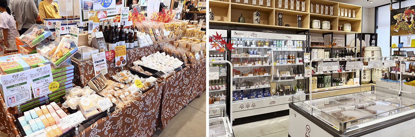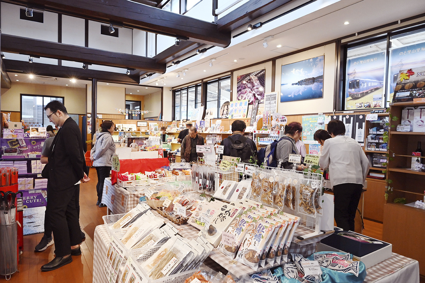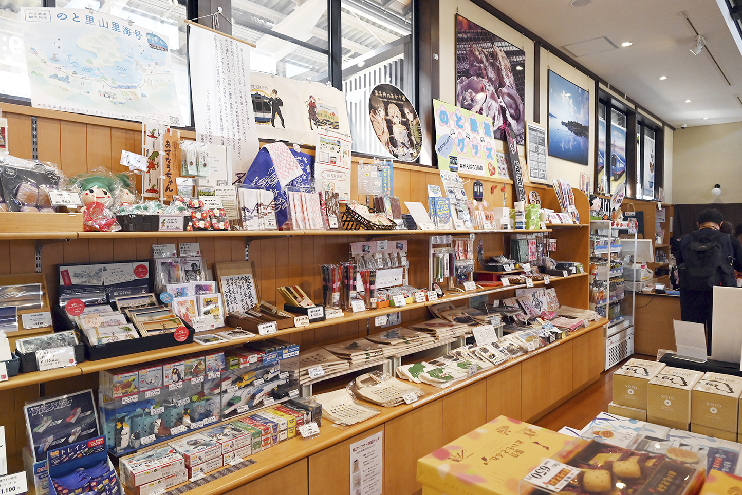 ここには能登半島の先端「奥能登」エリアを中心としたお土産品が揃い、お菓子や調味料、お酒、輪島塗のほか、のと鉄道オリジナルグッズや地元出身の力士・遠藤の関連グッズなど限定品のお土産も揃います。