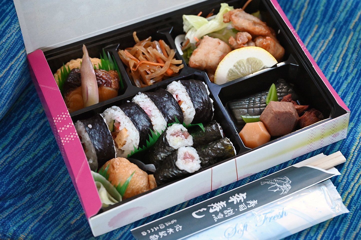 「七尾駅」からは再び「恋路観光」のバスに乗り換えて金沢市方面へ出発です。車中では穴水駅の駅前にある「幸寿司」特製のお弁当が配られ、少し遅めの昼食をいただきました。太巻、鉄火巻き、いなり寿司とタコと里芋の煮物、唐揚げなどバラエティ豊かな内容でボリュームも満点でした。