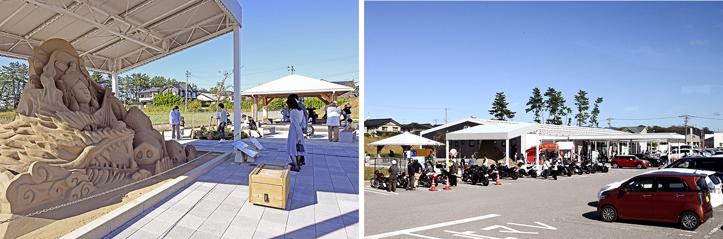 「道の駅 のと千里浜」は全国の道の駅ランキングでも上位に入る人気スポット。この日は連休中ということもあり、店内はもちろん、屋外にある足湯や砂像の周辺も多くの人で賑わっていました。